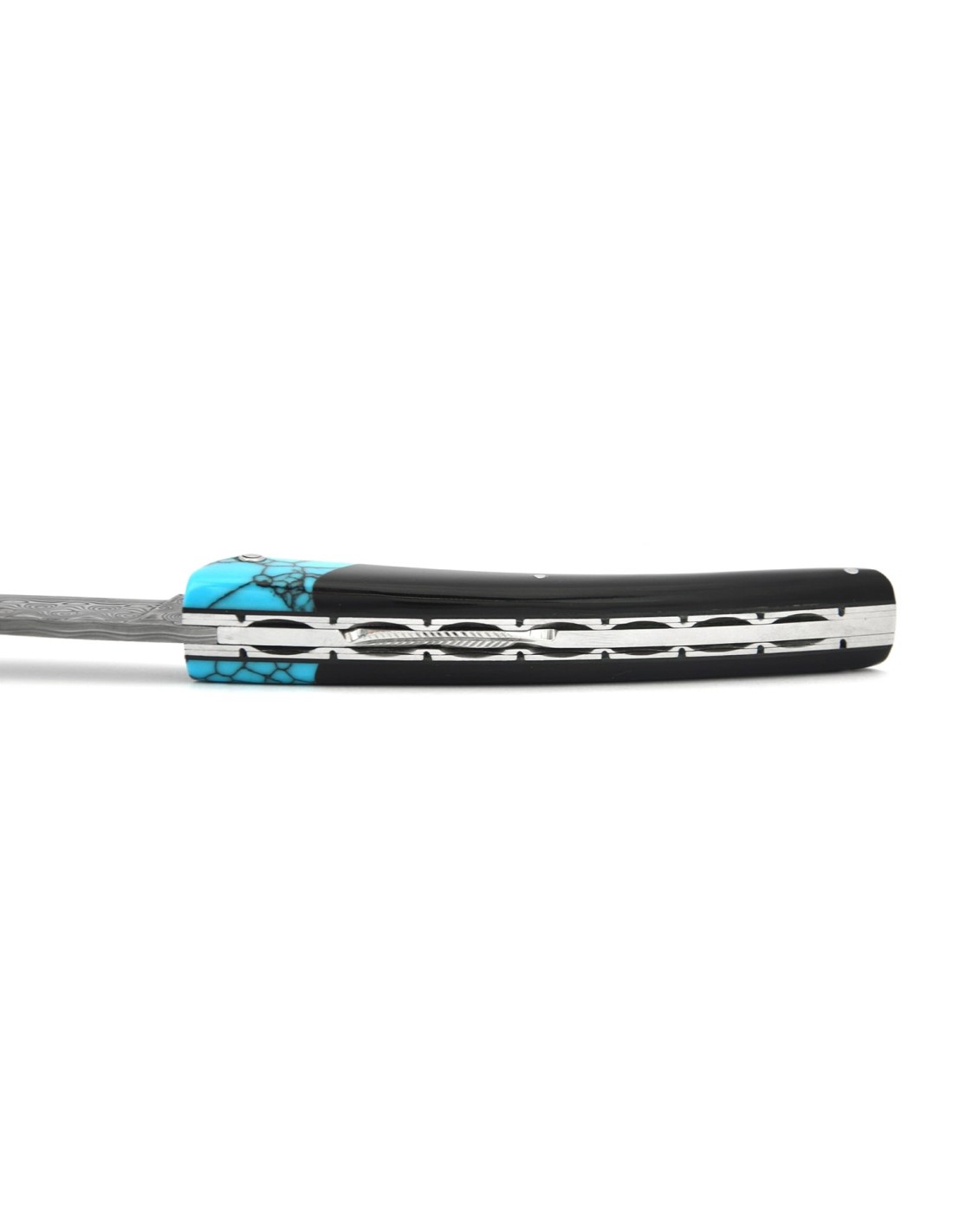 Front bolster made of turquoise reconstituted with shiny finish. Stainless Damascusteel blade.