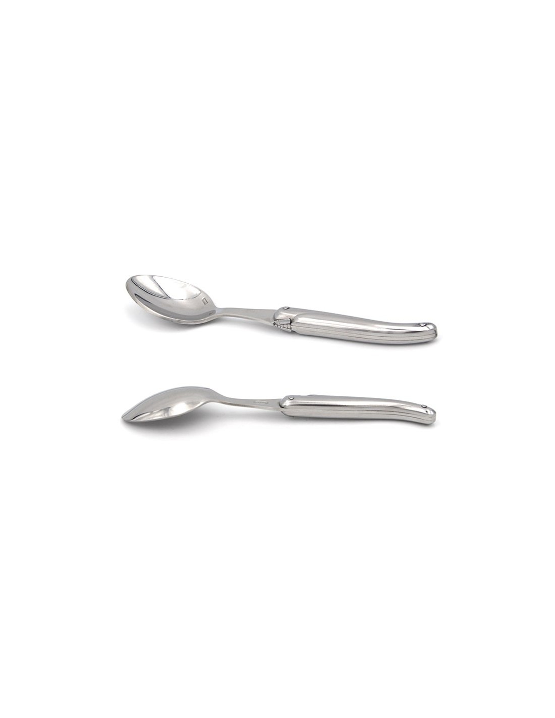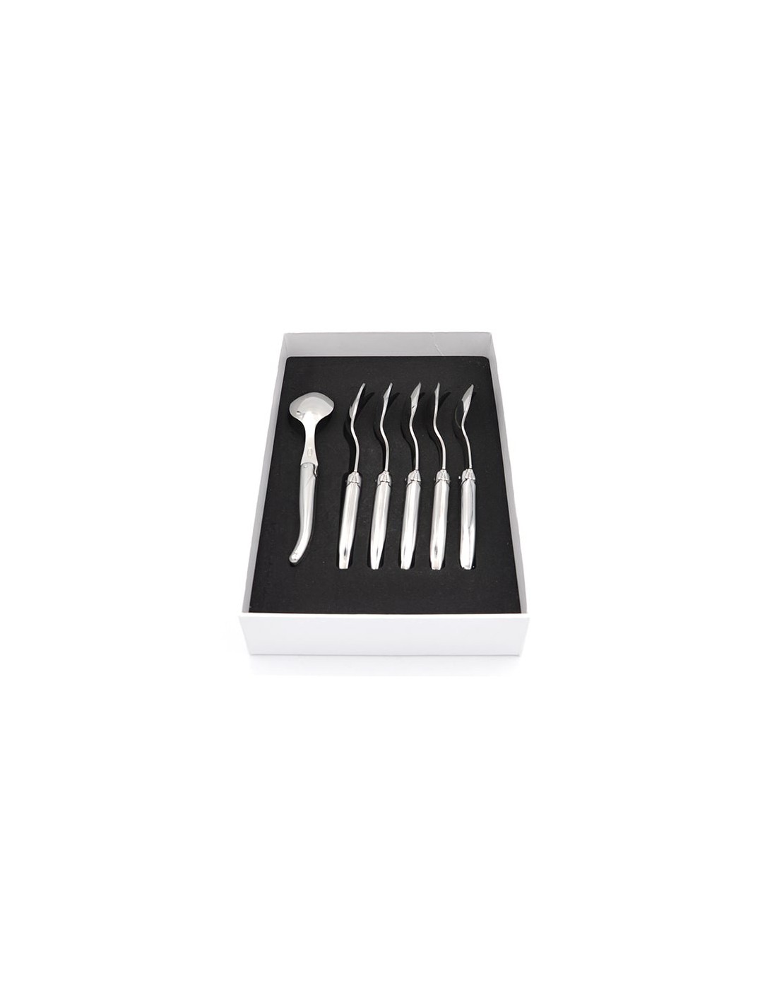 Box with 6 Laguiole Original steak knives, full handle all stainless steel with shiny finish.The total length of the steak knife is 23 cm.Welded bee & guilloché spring. Stainless steel blade 12c27.Dishwasher safe at 50°C.