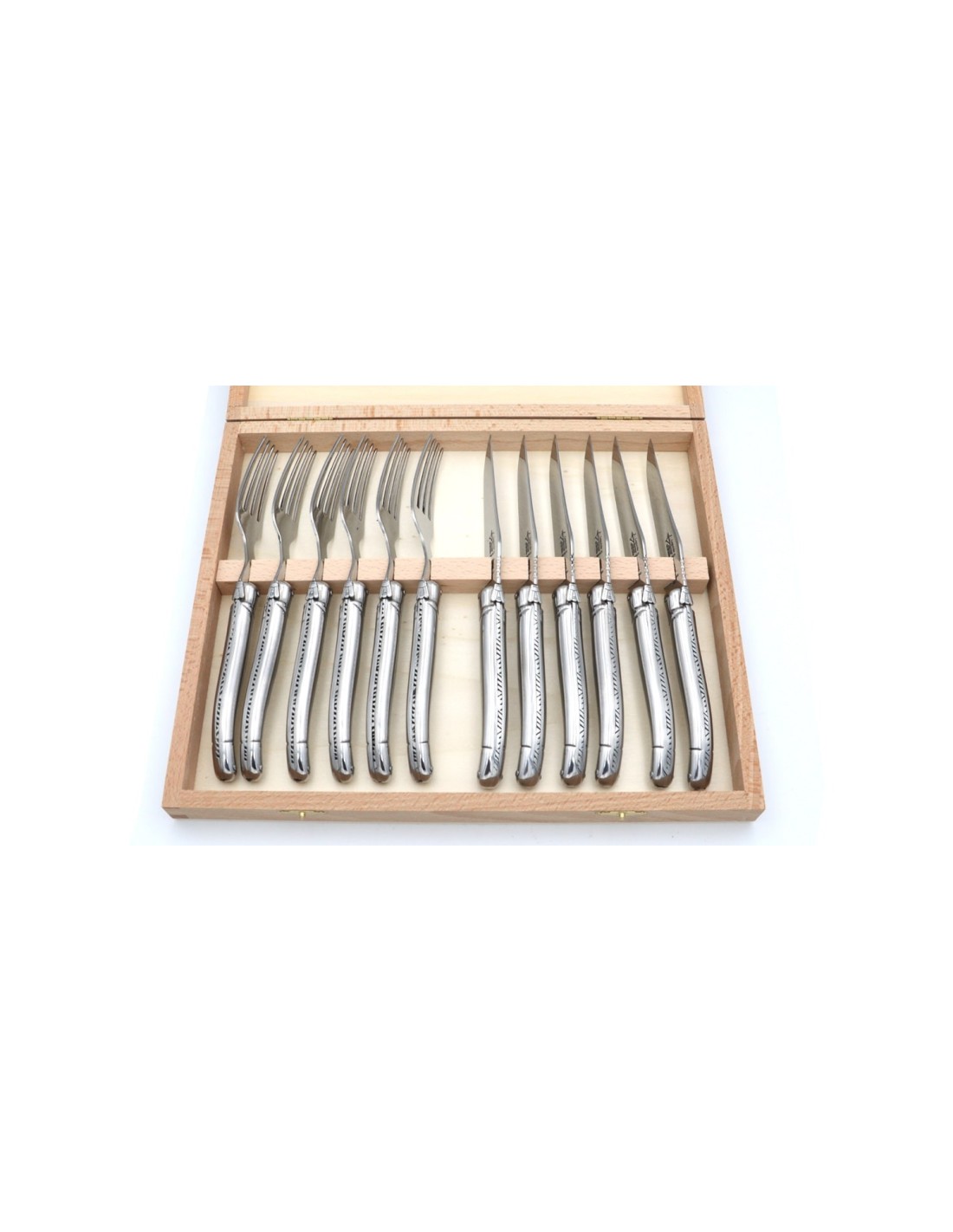 Laguiole cutlery set with:6 steak knives (total length of each steak knife is 23 cm)6 table forks6 table spoon6 tea spoonFull handle in stainless steel with a shiny finish.