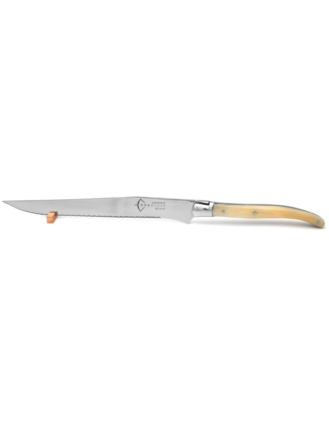 Laguiole bread knife, 12 cm olive wood handle.Welded bee & smooth spring.1 stainless steel bolster with matt finish. Stainless steel blade 12c27 with shiny finish.