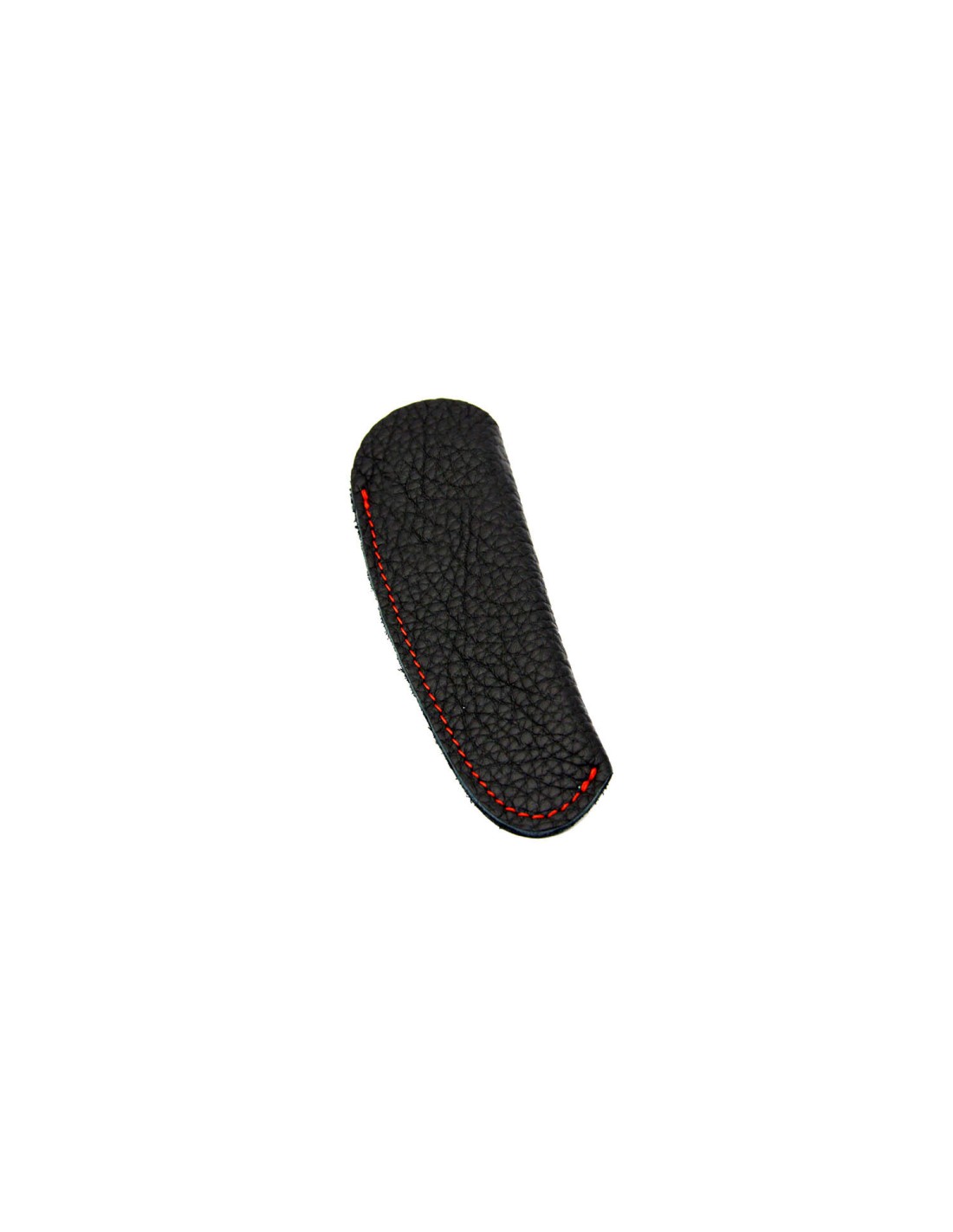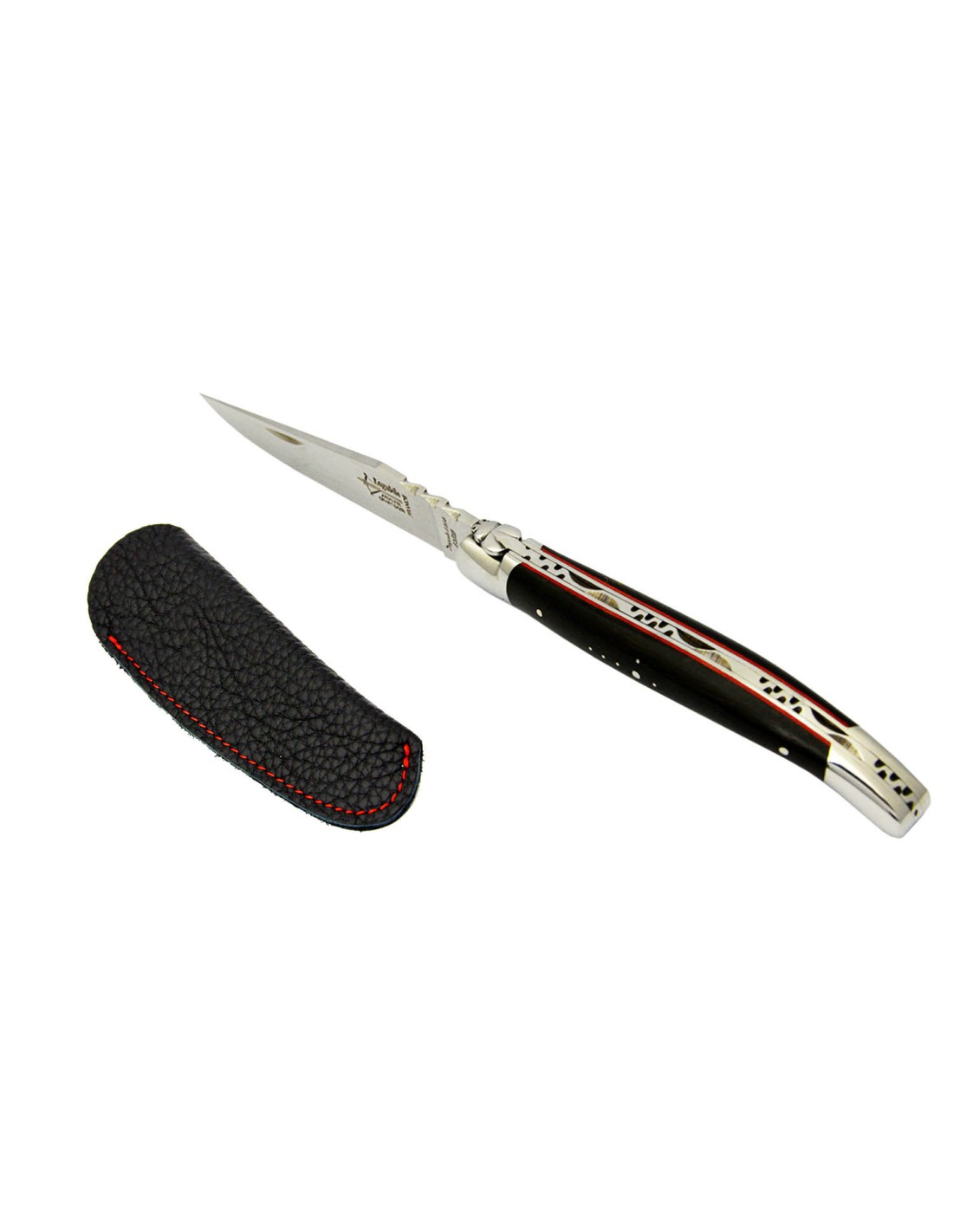 Pack Laguiole knife + black leather sheath, ebony with red vulcanized fiber handle, shiny finish