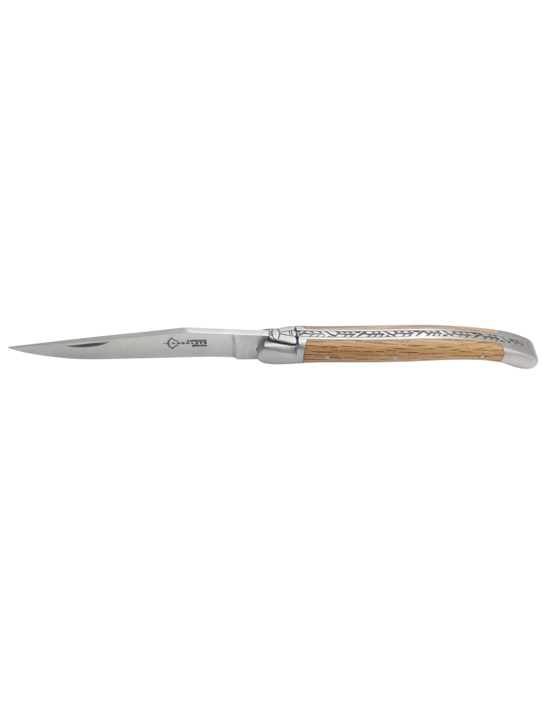 Laguiole folding knife Forged, 12cm ram's horn handle.Forged bee & hand-guilloché spring.2 stainless steel bolsters with shiny finish. Stainless steel blade 12c27.