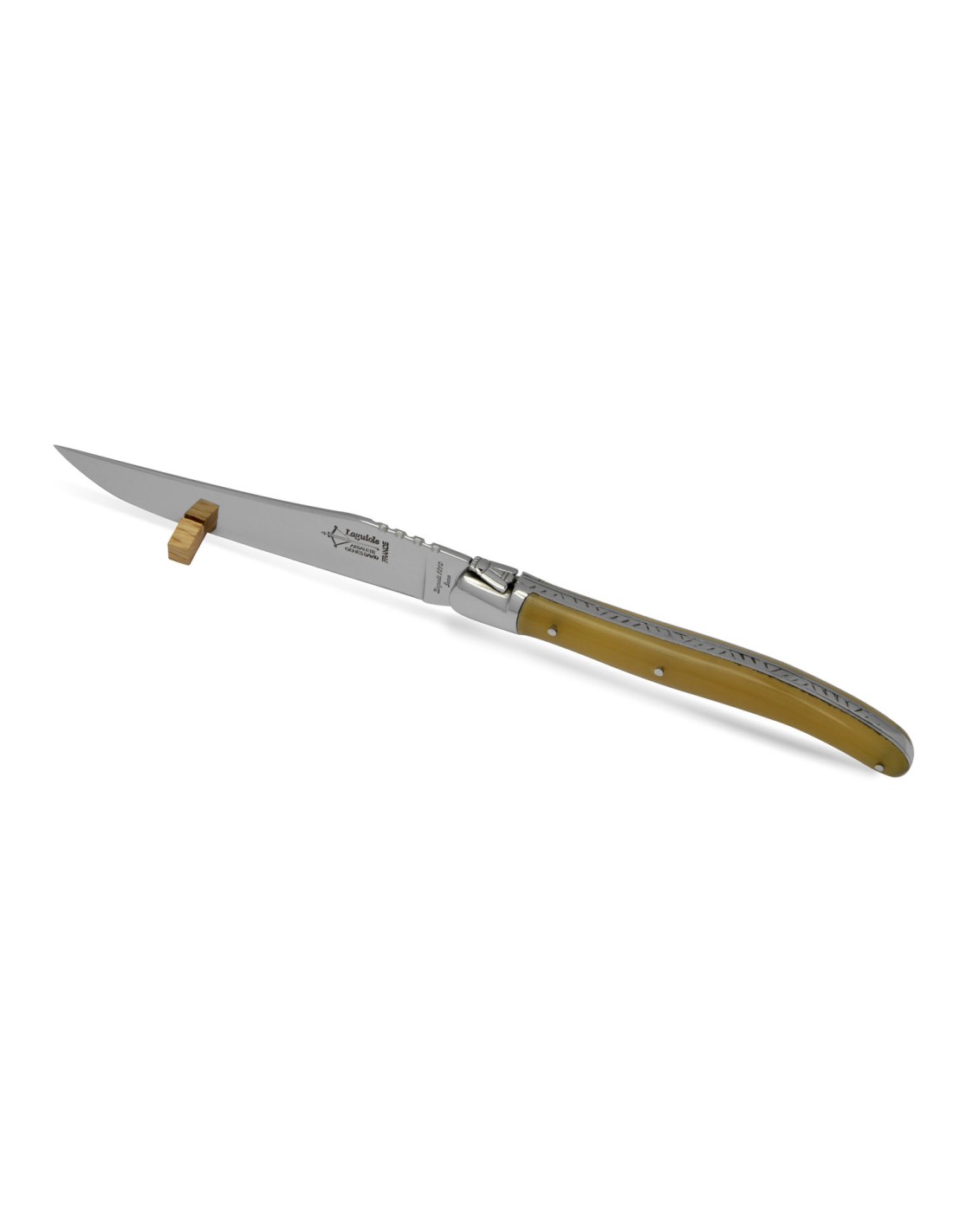 Box with 6 steak knives Laguiole Prestige, deer antlers handle.Total length: 23 cm.Welded Bee & hand-chiseled spring.1 stainless steel bolster with shiny finish. Stainless steel blade 12c27.