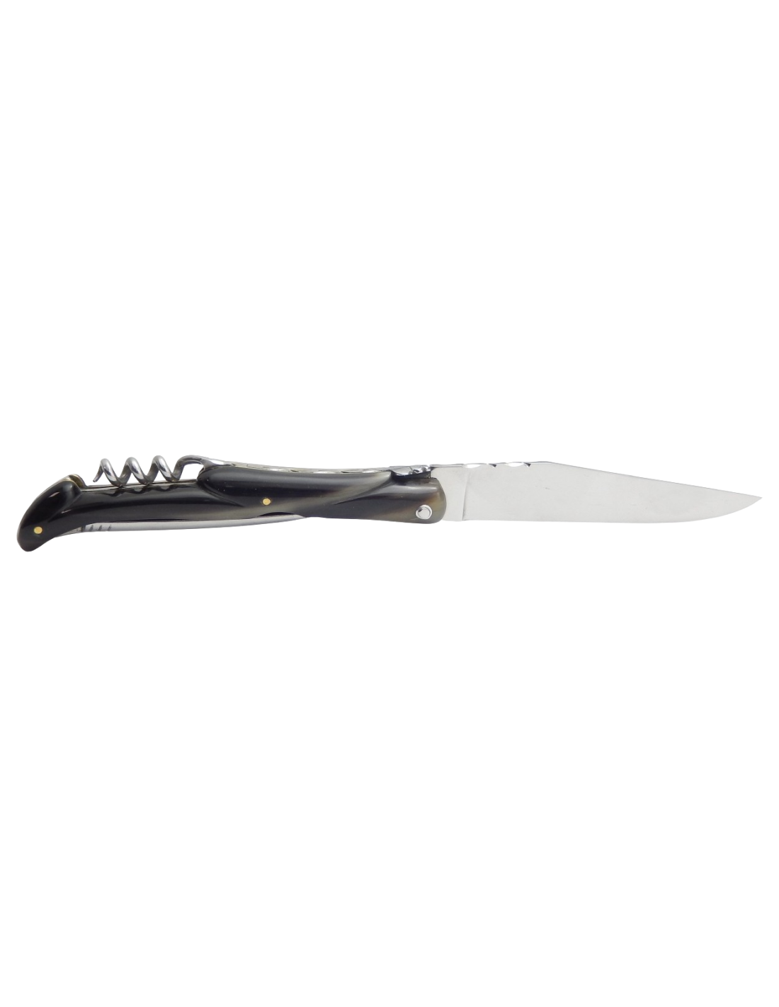 Couteau pliant forgé, manche en pointe de corne foncée de 12 cm.3 pièces : la lame & le tire-bouchon & le poinçon.Abeille forgée & ressort guilloché main.2 mitres inox avec finition brillant. Lame inox 12c27.