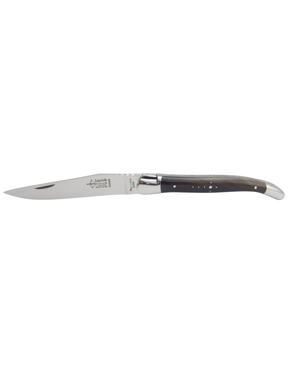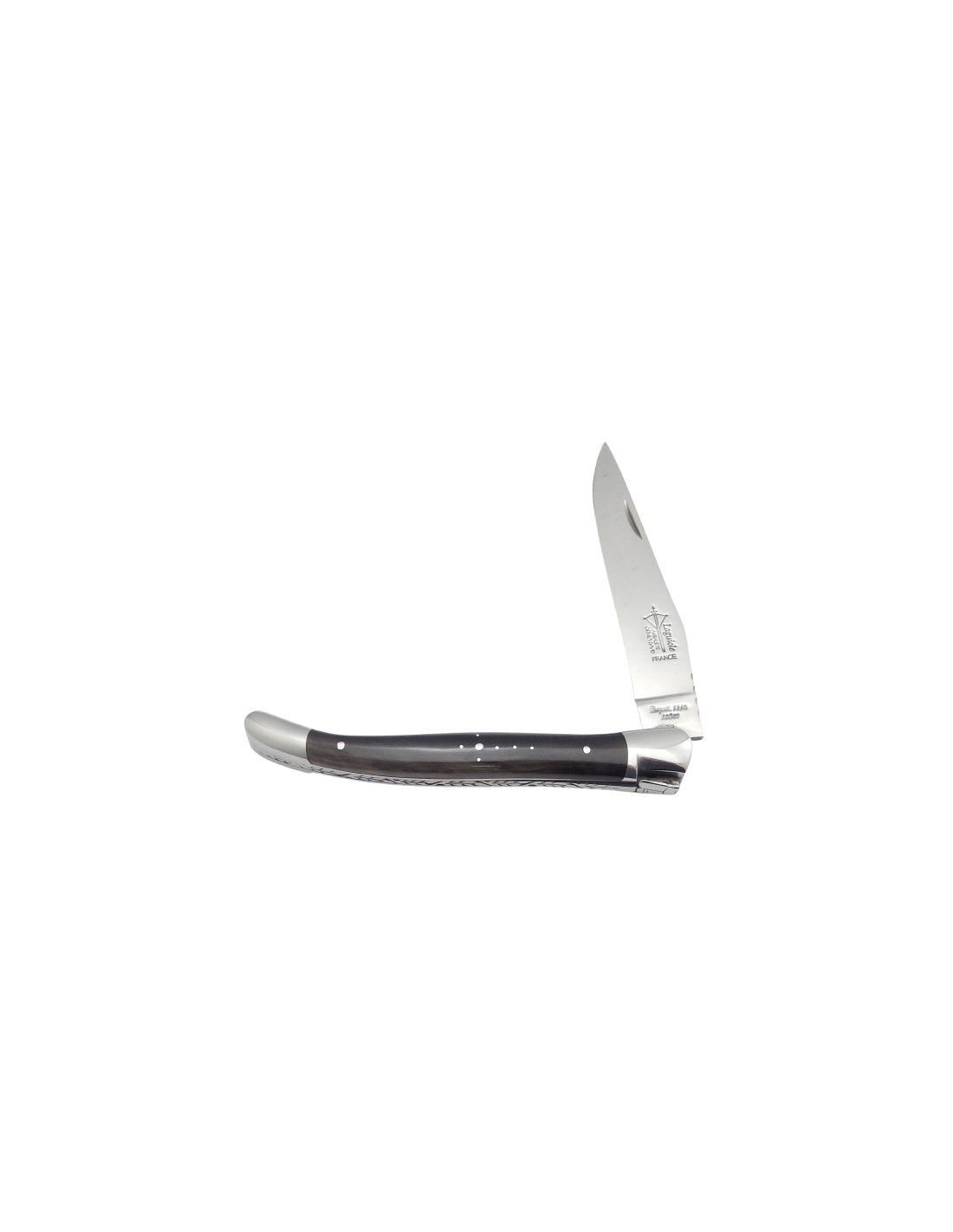 Couteau pliant Laguiole Prestige, manche en inclusion de plume de bécasse de 12 cm.1 plume de bécasse est présente de chaque côté du manche.Abeille soudée & ressort ciselé.2 mitres inox avec finition brillant. Lame inox 12c27.