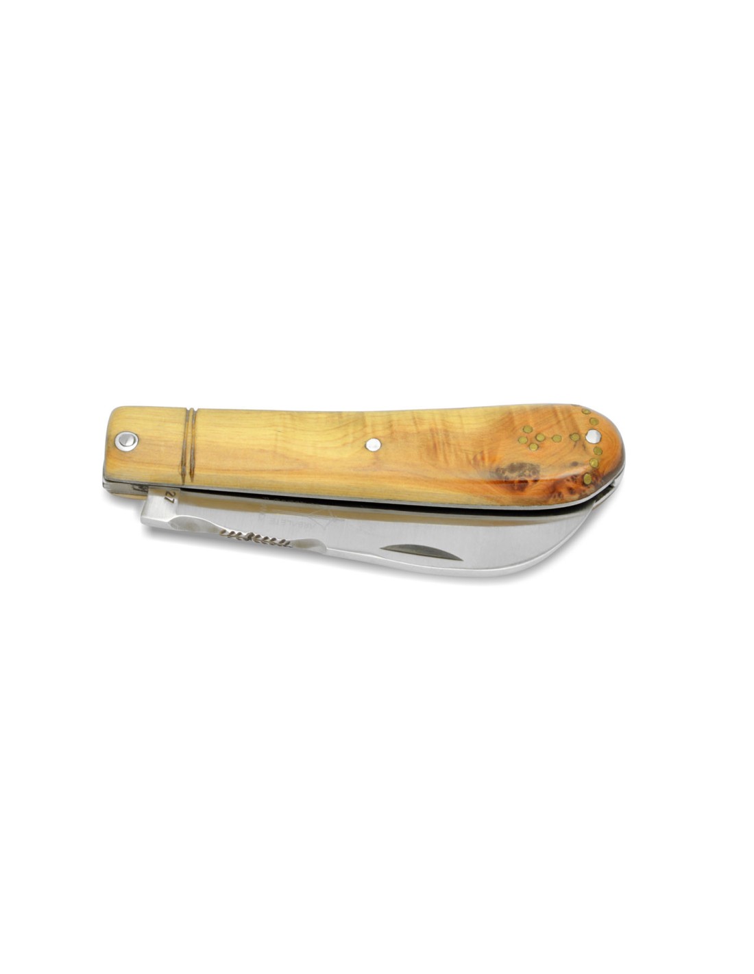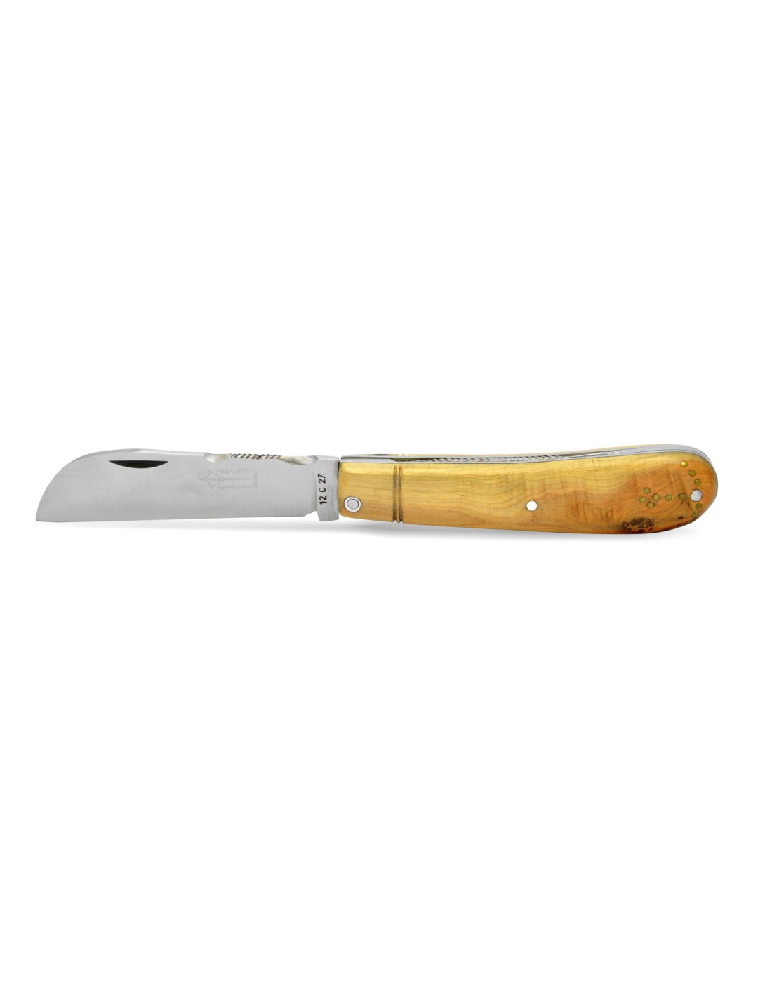 Couteau pliant régional, modèle Aurillac, manche en genévrier de 11 cm.Ressort & dos de lame ciselés main.Plein manche avec finition mat. Lame inox 12C27finition mat.